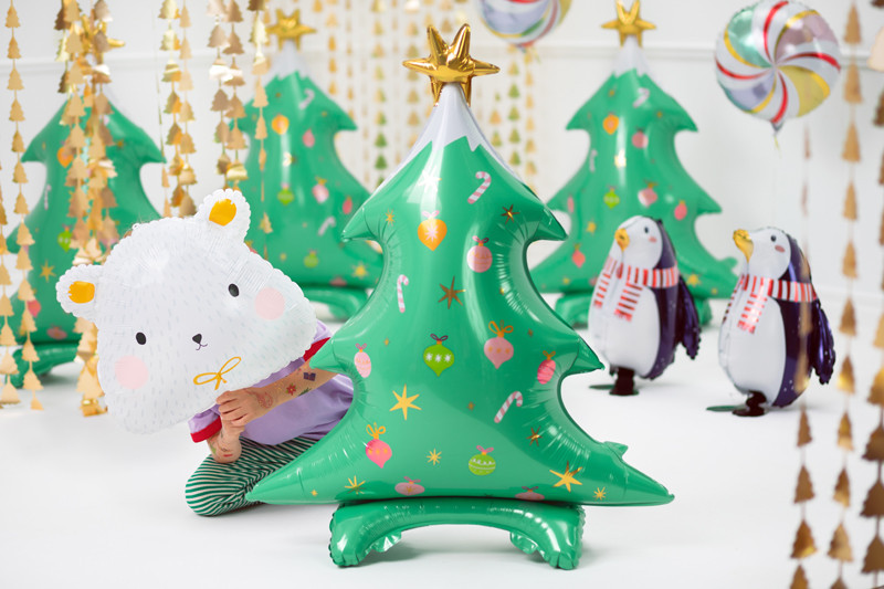 Varázsold el az ünnepi eseményeket ezzel a színes és arany mintás karácsonyfa formájú álló fólia léggömbbel! Nagyméretű, látványos lufi, a mérete felfújás előtt kb. 78 x 94 cm (30,5 x 37'').