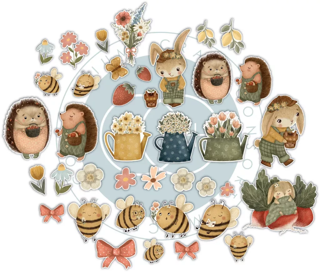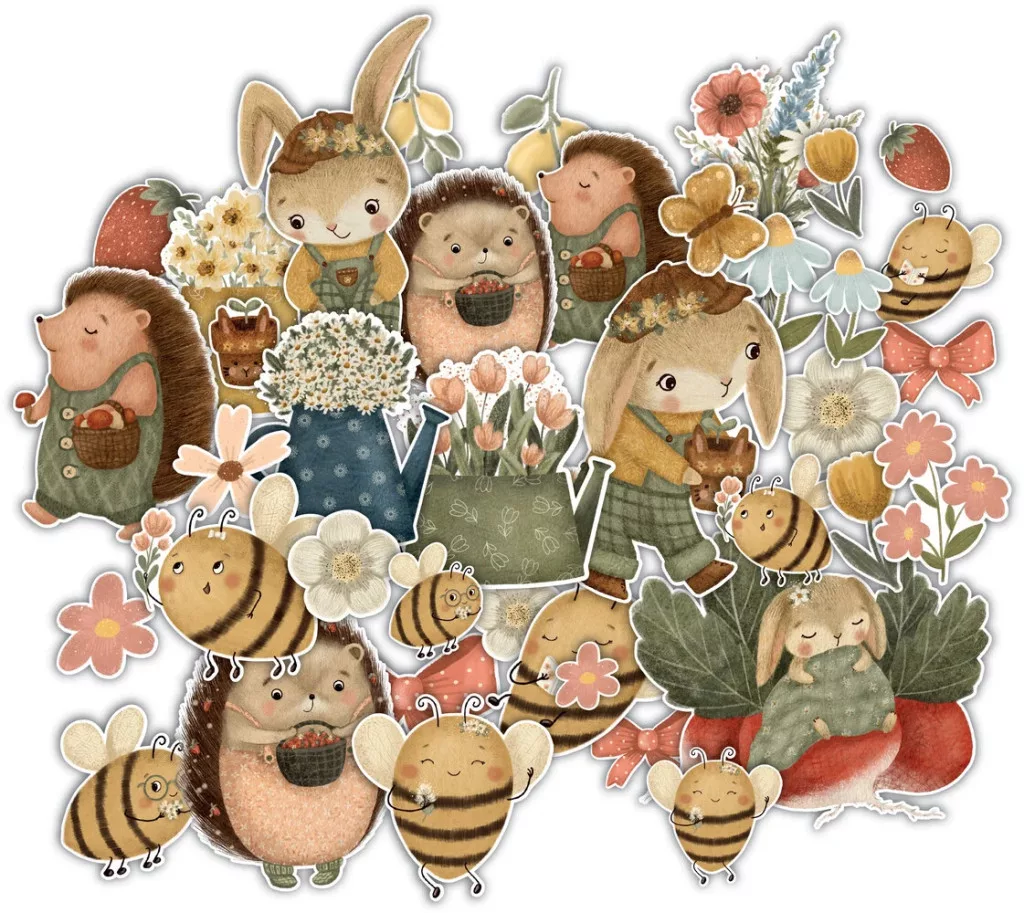 Rendkívül részletgazdag ephemera szett lézerrel kivágott díszítőelemeket tartalmaz: szerethető nyuszikat, méheket, virágokat, gombákat és egyéb bájos erdei motívumokat. A chipboard vastag, 300 g/m²-es FSC-tanúsított kartonból készült, így tartós, mégis könnyen kezelhető.