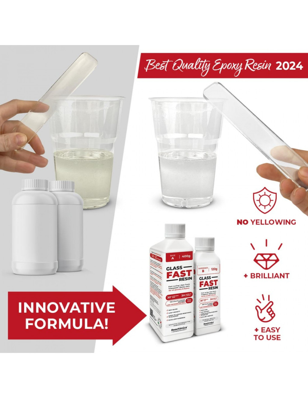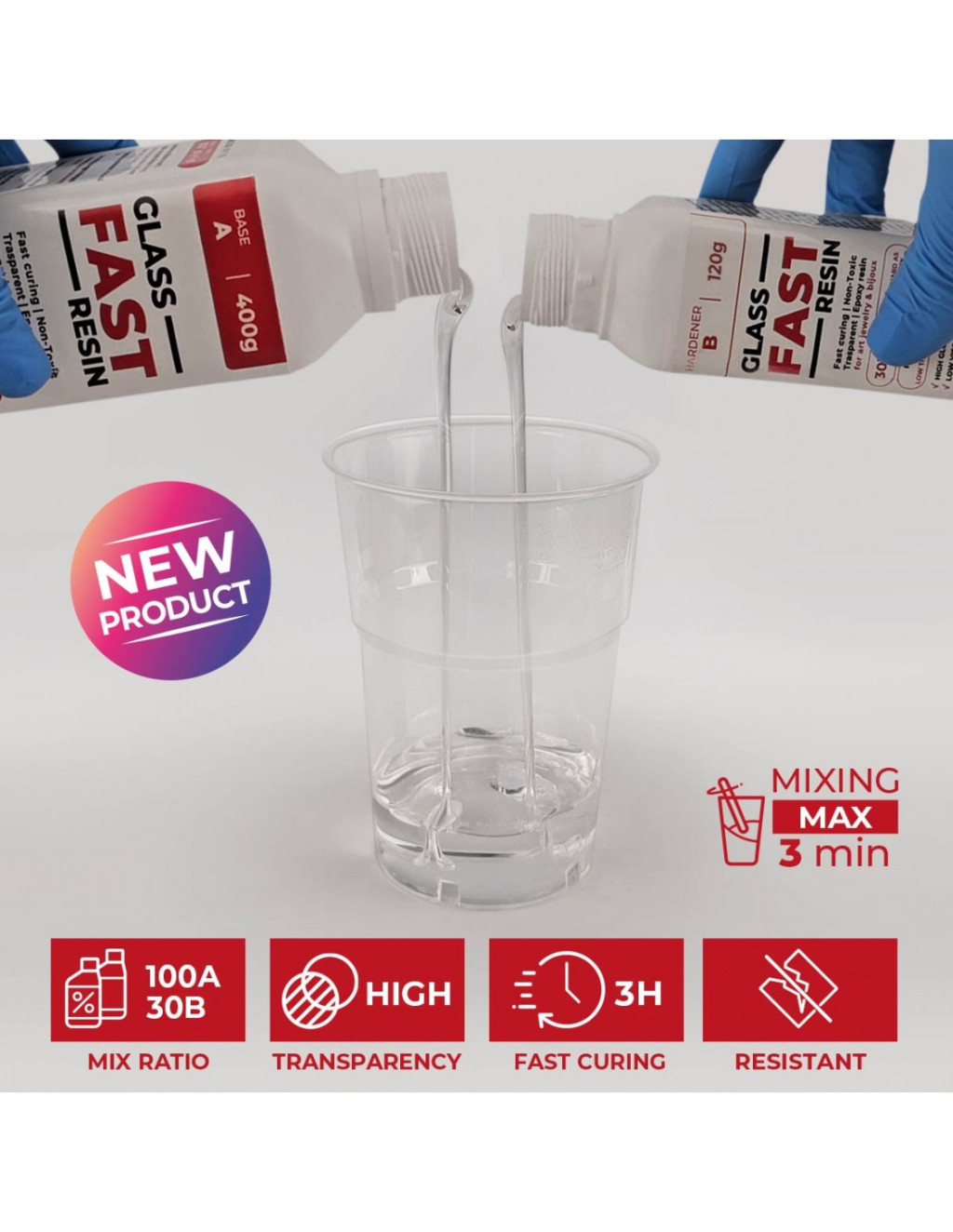 A Glass Fast Resin – egy forradalmian új, biztonságos és rendkívül folyékony, átlátszó epoxi gyanta (100:30 katalízis arány). Fedezd fel a használat egyszerűségét, a külső hatásokkal szembeni ellenálló képességét, valamint sokoldalúságát művészeti, modellezési és ékszerkészítési projektekben.