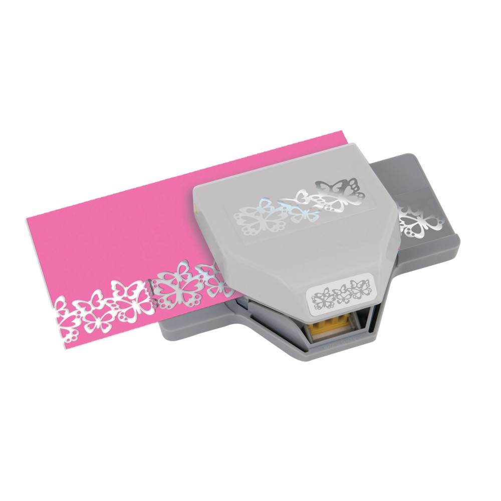 Felhasználóbarát, karos, szegélyvágó lyukasztó. A lyukasztóra nyomtatott ismétlődő minta segít a folyamatos szegély kialakításában.