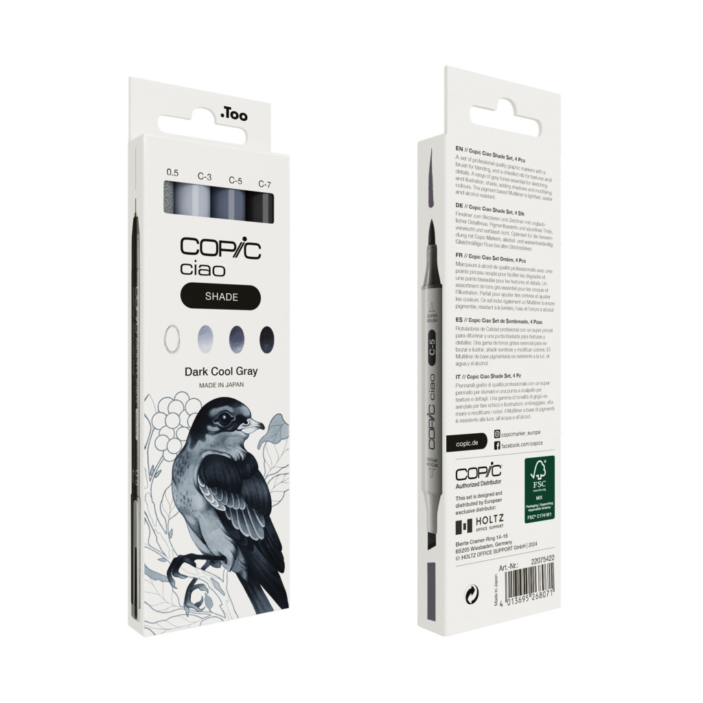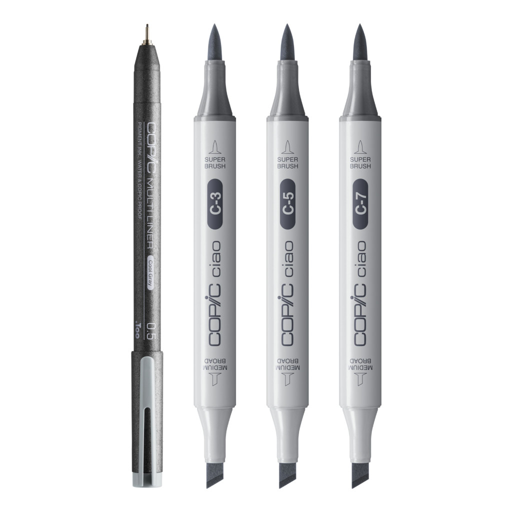 • Válogatott készletek: 12 népszerű Copic Ciao marker, négy szettben, mindegyik három árnyalatot tartalmazó szürkével: hűvös szürke, világos és sötét árnyalatokban.