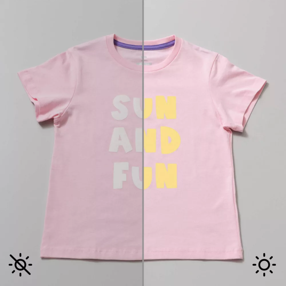 Az UV-aktivált, színváltó vasalható feliratok a napfény hatására átalakulnak.