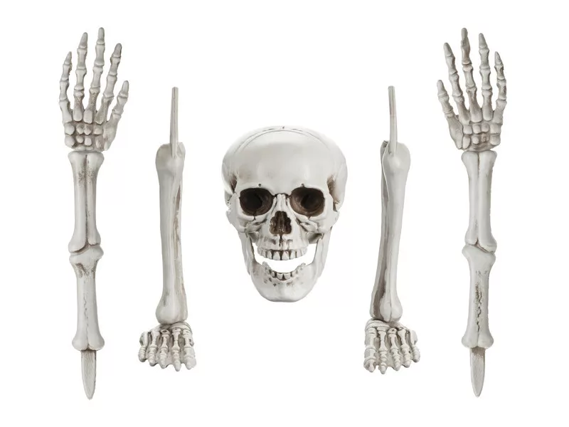 Tedd felejthetetlenné a halloween dekorációdat ezzel a hátborzongató csontváz szettel! A dekoráció 5 különálló elemből áll: egy élethű koponya, valamint két kar és két láb, amelyeket könnyedén a földbe szúrhatsz a kertben, vagy elhelyezhetsz beltéren is.