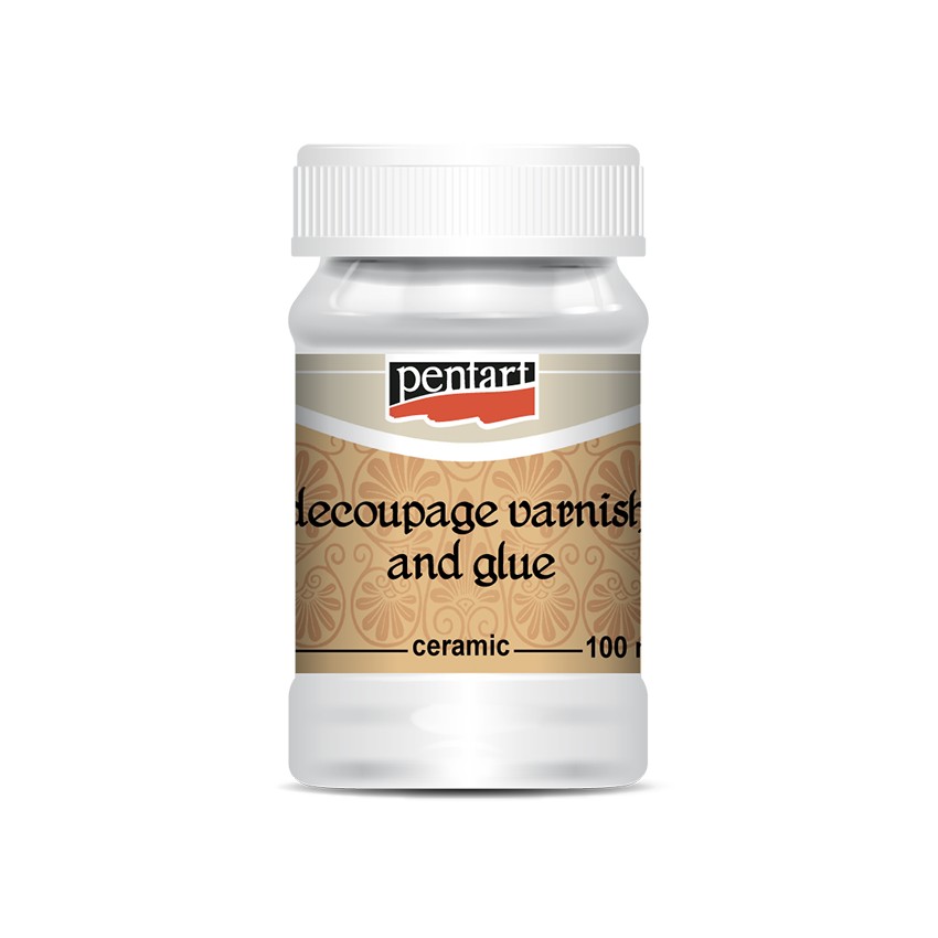 Pentart dekupázs (decoupage) ragasztólakk, kerámiára. Jó tapadású ragasztó és lakk egyben nem porózus felületekre (pl. üveg, mázas kerámia).