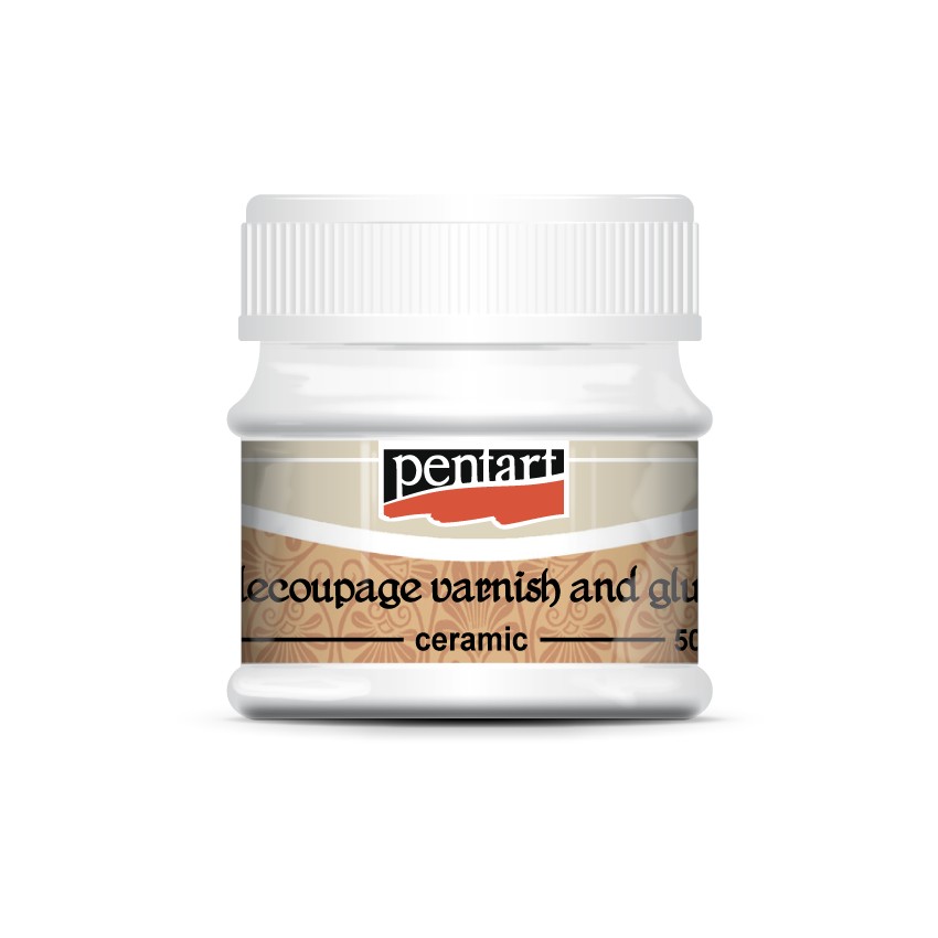 Pentart dekupázs (decoupage) ragasztólakk, kerámiára. Jó tapadású ragasztó és lakk egyben nem porózus felületekre (pl. üveg, mázas kerámia).