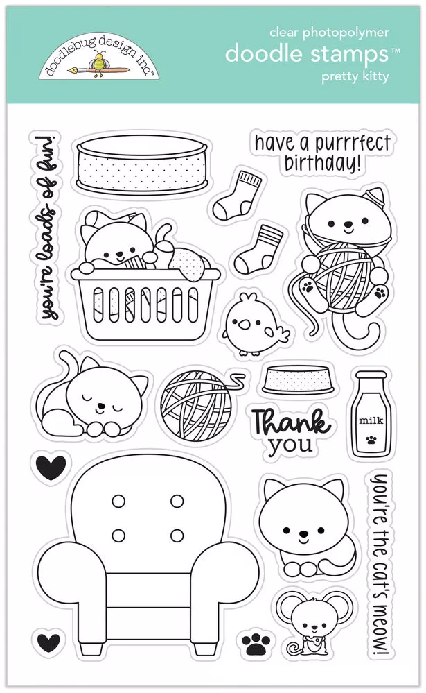 Doodlebug Design - Szilikonbélyegző készlet, cicás témában. Használd önmagában, vagy kombináld a hozzá tartozó vágósablonnal. Használatához akril blokk (bélyegző alátét) vagy bélyegző pozícionáló szükséges.