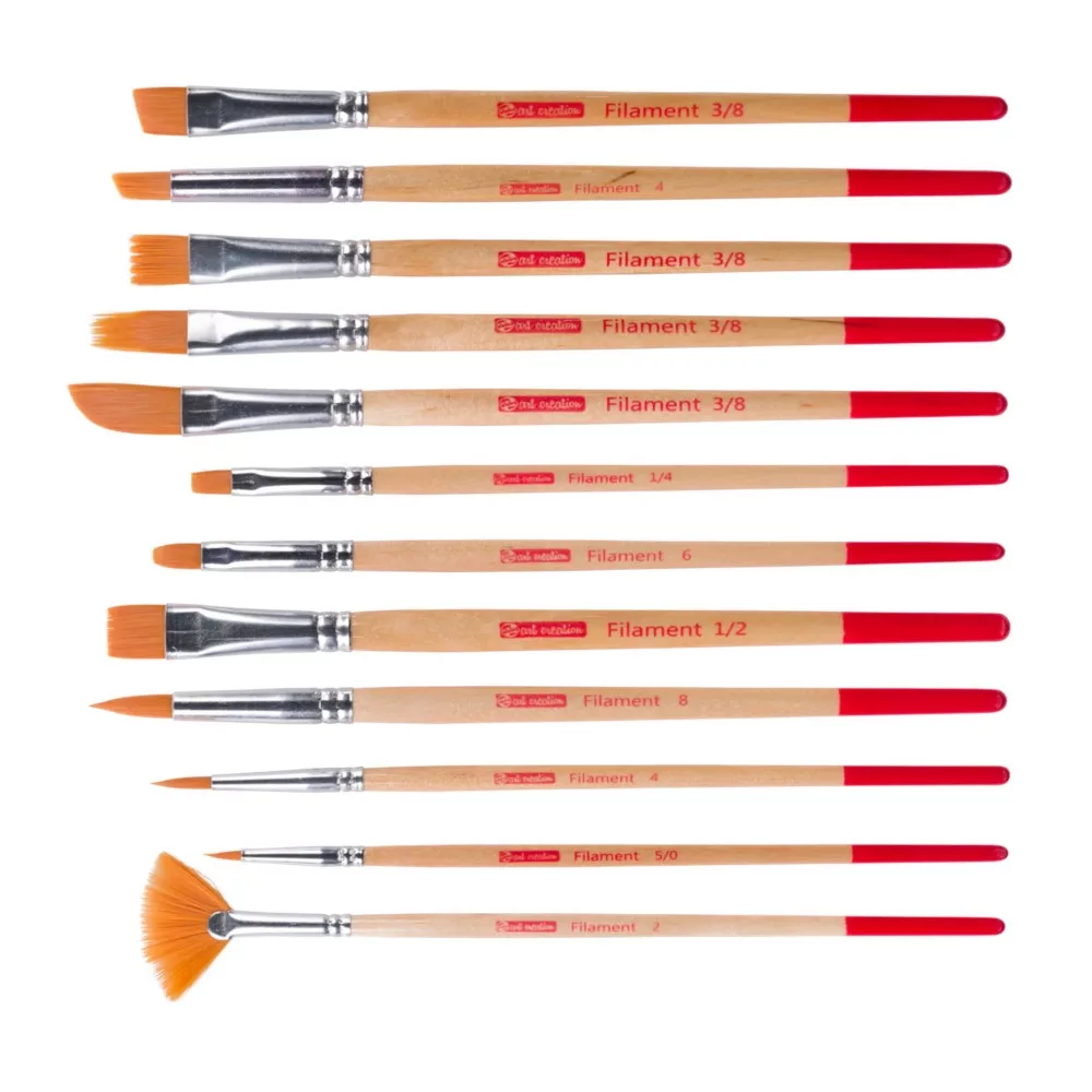 Art Creation Filament ecset sok vizet képes felszívni, ezért alkalmas erősen hígított festékekhez, például vízfestékekhez és tintákhoz. A készlet különféle formájú ecsetet tartalmaz, amelyek mindegyike különböző hatásokat vagy ecsetvonásokat eredményez.