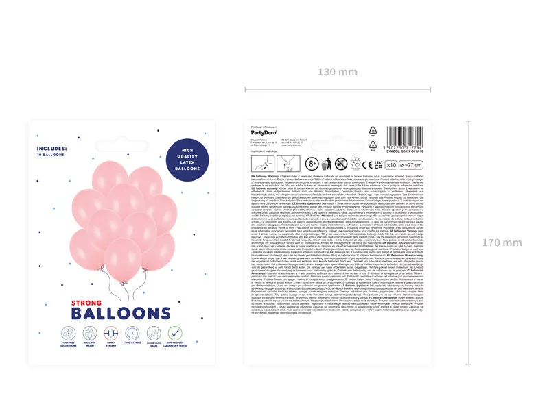A PartyDeco Strong Balloons márkájú lufik tartósságukról és kiváló anyagminőségükről híresek. Ez a 10 darabos kiszerelésű csomag 27 cm átmérőjű, matthatású (ún. "pasztell") lufikat tartalmaz, amelyek tökéletesen illenek bármilyen alkalomhoz – legyen szó gyerekzsúrról, babaváró buliról, esküvőről vagy céges rendezvényről. A lufik levegővel és héliummal is felfújhatók, színük felfújás után éri el végleges árnyalatát.