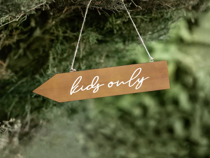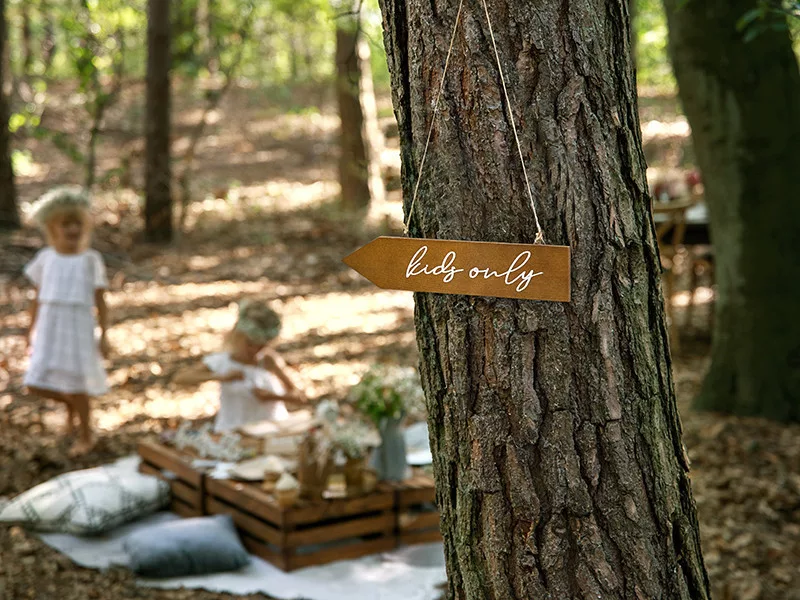 Hozz létre egy különleges gyerekeknek szóló zónát ezzel a bájos, fából készült irányjelző táblával! A fehér „Kids Only” felirat garantáltan felkelti a kicsik figyelmét, és segít kijelölni a számukra fenntartott helyet esküvőkön, születésnapokon vagy bármilyen családi eseményen.
