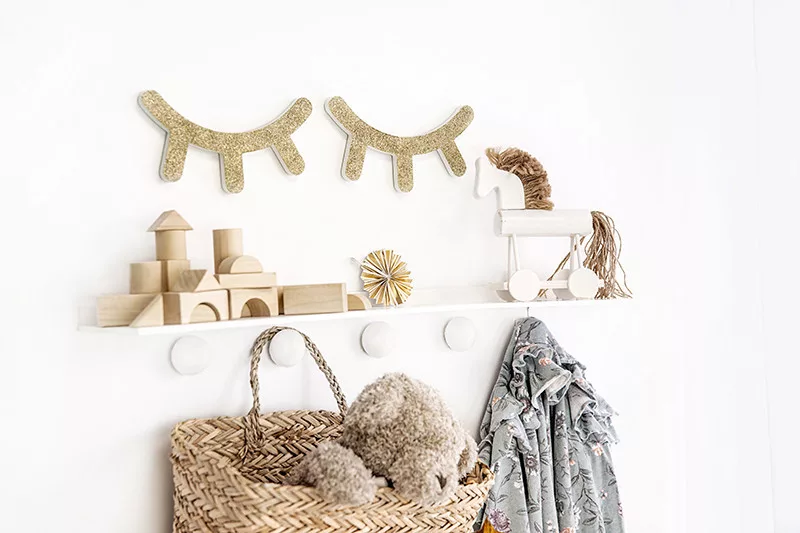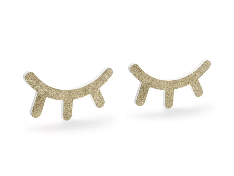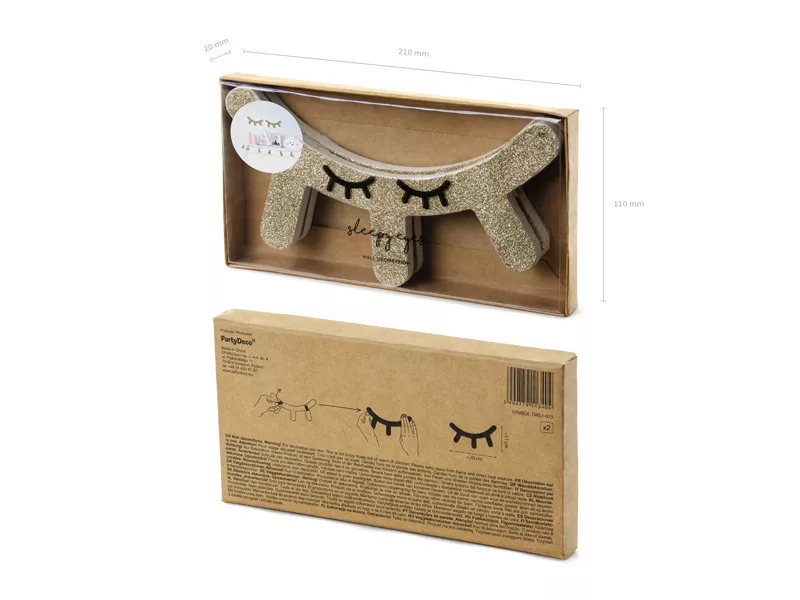 Ez a fából készült fali dekoráció egyedi és bájos kiegészítője lehet bármelyik gyerekszobának vagy modern enteriőrnek. A fehér alapon arany csillámos alvó szemek nyugodt, meghitt hangulatot teremtenek, és tökéletesen illenek babaszobákba, hálószobákba vagy kreatív dekorációs projektekhez. A készlet tartalmaz 2 db alvó szemet és kétoldalas ragasztószalagot, amely megkönnyíti a falra rögzítést.