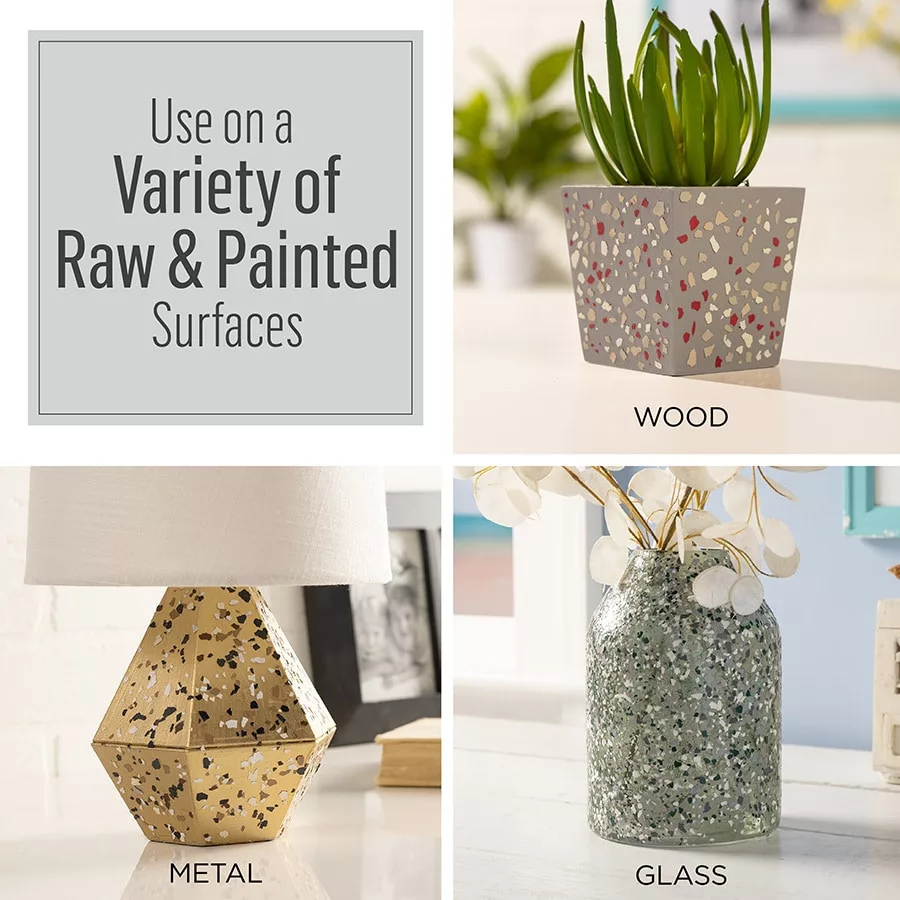 A FolkArt Terrazzo Flakes számos kezeletlen és festett felületen használható, beleértve a fát, fémet, üveget, kerámiát vagy terrakottát.