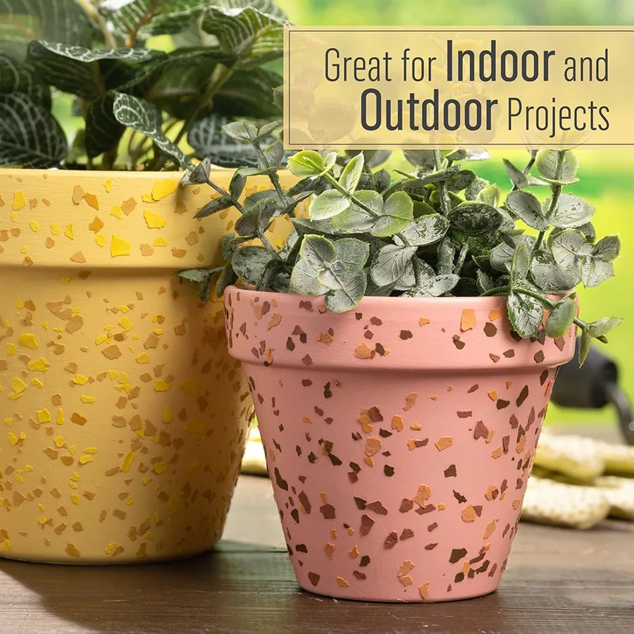 A FolkArt Terrazzo Flakes számos kezeletlen és festett felületen használható, beleértve a fát, fémet, üveget, kerámiát vagy terrakottát.