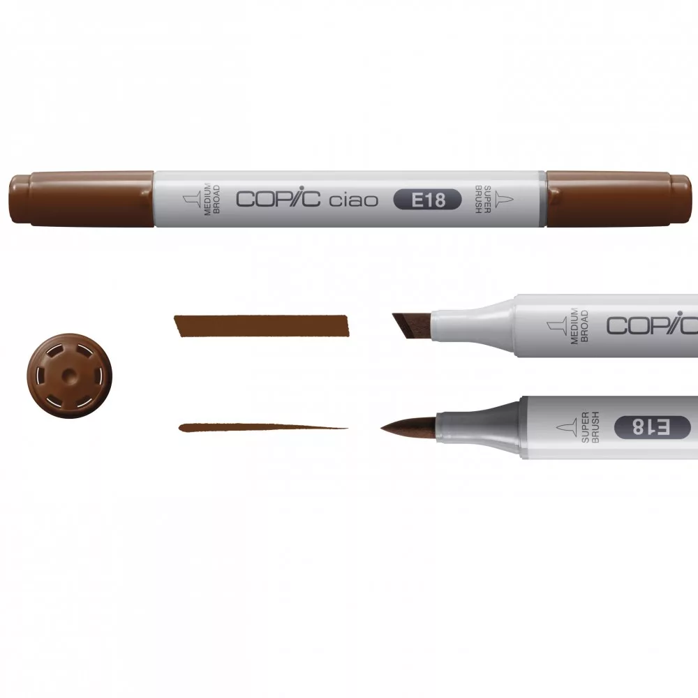 • A Copic Ciao a tökéletes grafikus jelölő kezdőknek és profi alkotóknak. A színek keverhetők vagy rétegezhetők, hogy mélységet és textúrát adjanak a rajzhoz. A két hegy – vágott közép vastag és ecsethegy  – lágy és pontos mozdulatokat tesz lehetővé. Professzionális minőségű alkohol és színpigment alapú tintákkal készült. Gyorsan szárad és nem kenődik el. Újratölthető Copic Ink tintával, amely 180 árnyalatban kapható.