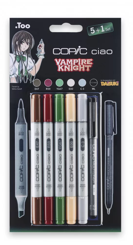 5 db COPIC ciao alkoholos marker, egyik oldalon vágott közép vastag, a másik oldalon pedig ecsetheggyel (+1 db fekete 0,3 mm vékony MULTILINER tűfilc) - Vampire Knight