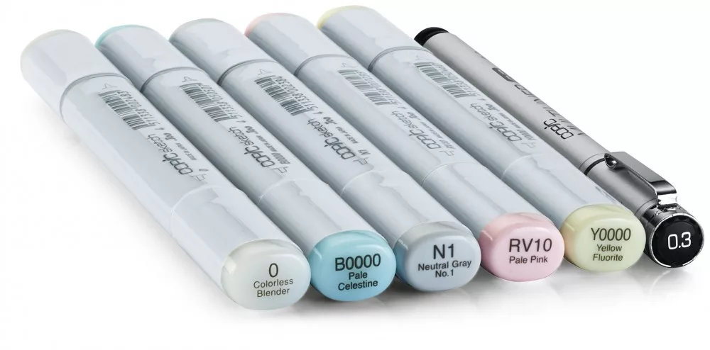COPIC Sketch grafikai filctoll készlet. Egyik oldalon vágott közép vastag, a másik oldalon ecsetheggyel - Alapszínek keveréshez. Színek: 0, B0000, N-1, RV10, Y0000, Copic Multi Liner SP Black 0.3 mm
