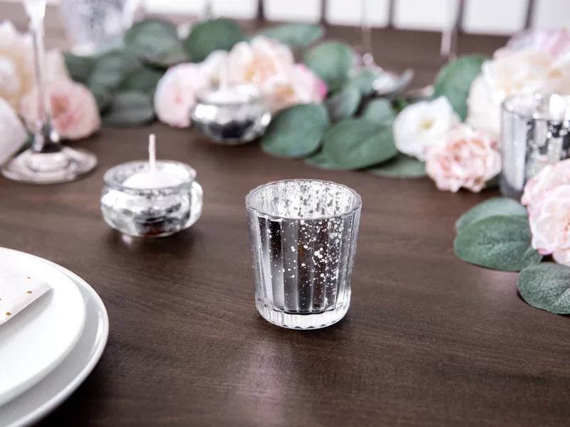 Elegáns és modern üveg gyertyatartó tükör ezüst színben, amely gyönyörűen tükrözi a fényt, és különleges hangulatot teremt minden alkalomra. Mérete kb. 6 cm, így tökéletes tealight mécsesekhez.