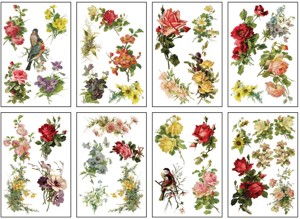 A készleten belüli minták finom, festői részletekkel és lágy színátmenetekkel idézik Klein stílusát: spontán rózsacsokrok, virágzó ágak, kézzel festett madarak – tökéletesen illenek bútorfelújításokhoz, faliképekhez vagy kis dekorációs tárgyakhoz.