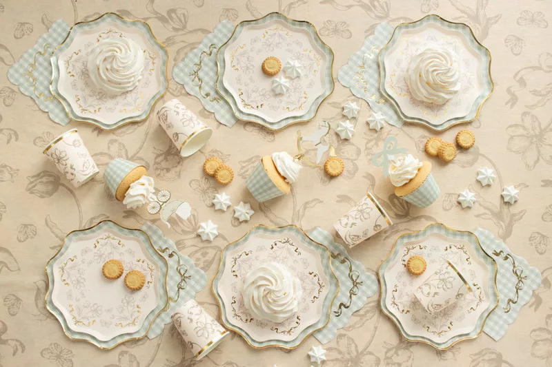 • Azonos mintájú tányérokkal, poharakkal, asztalterítővel