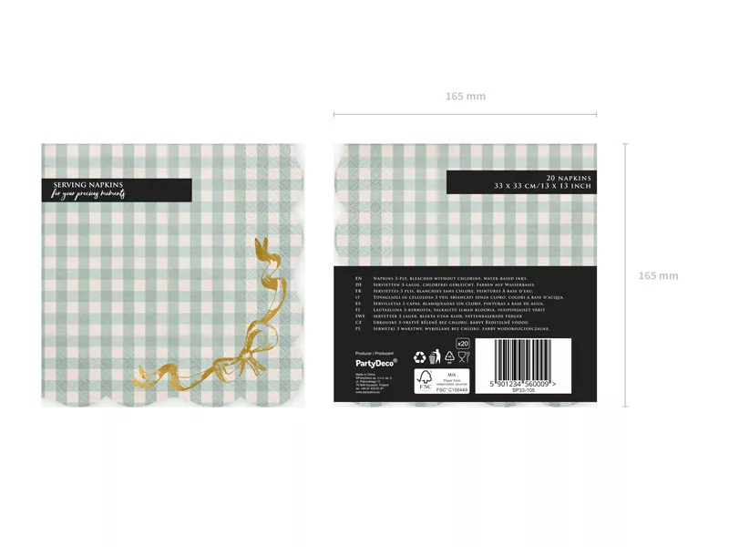 Ez a kockás mintás, arany masnis papírszalvéta szett egyedi hangulatot varázsol bármilyen alkalomra – legyen szó születésnapról, babaváróról, kerti partyról vagy akár karácsonyi reggeliről. A zöld-fehér kockás minta klasszikus és barátságos, az aranyosan csillogó masni pedig különleges, ünnepi jelleget kölcsönöz neki.