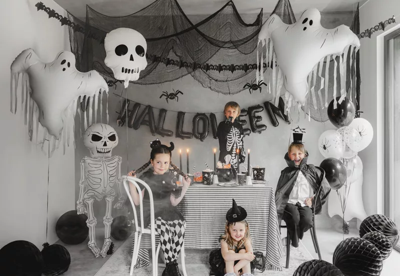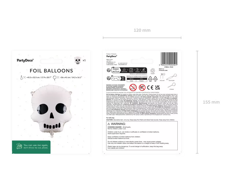 Teremts igazán borzongató, mégis játékos hangulatot ezzel a koponya alakú fólia lufival! A krémszínű alap és a fekete részletek egyszerre keltik a halloween dekoráció klasszikus, félelmetes hangulatát, ugyanakkor barátságos megjelenésük miatt gyerekbulikra is tökéletesen illenek.