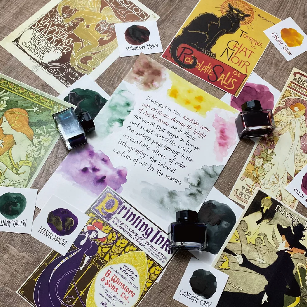 Az 1902-ben alapított Kuretake a szecesszió csúcspontján jött létre, egy esztétikai mozgalom, amely Európában kezdődött és az egész világon végigsöpört. Az ink-cafe paletta a színes litográfia ellenállhatatlan vonzereje előtt tiszteleg – a tömegek kedvelt művészeti médiuma.