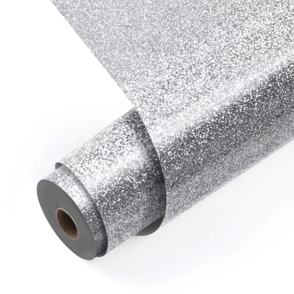 Ragyogó, ezüst csillámos vasalható glitter HTV fólia egyedi pólókhoz, vászontáskákhoz, sapkákhoz és kreatív textilprojektekhez.
