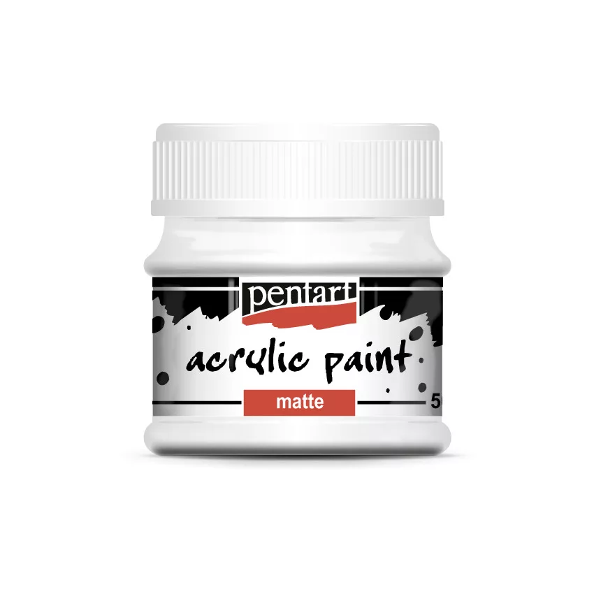 Matt akrilfesték 50 ml fehér. A Pentart akrilfestékek nagy pigment-tartalmú, kiválóan fedő, vízbázisú termékek. Vízzel hígíthatók, száradás után vízálló felületet képeznek.