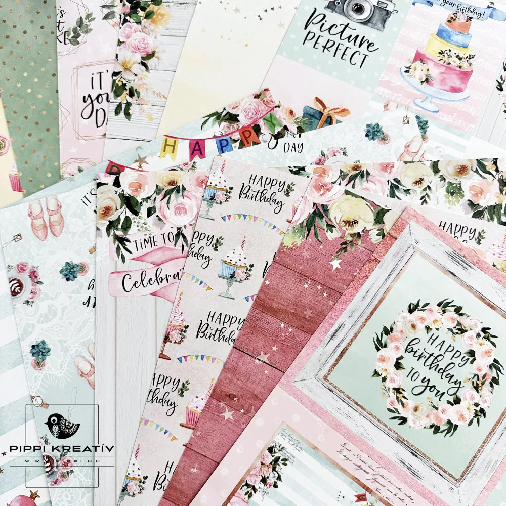 • 12 lap, 12"x12" (30.48 cm * 30.48 cm), mindkét oldalán mintás scrapbook papír