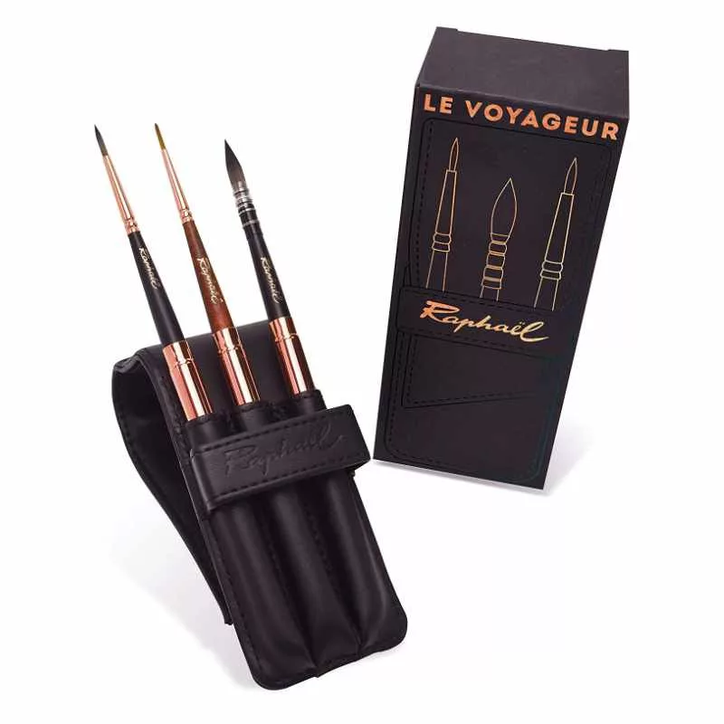 A Raphael Le Voyager Black Wallet készlet három professzionális és összecsukható ecsetet tartalmaz: Soft Aqua kerek 6-os, Soft Aqua Quill 3/0-as és Precision kerek 6-os méretű ecsetet.