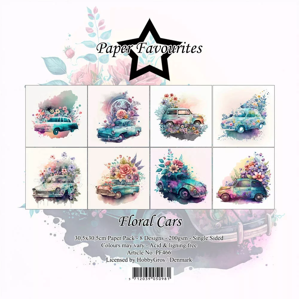 A Floral Cars készlet 8 db 12x12 Inch (30.48 x 30.48 cm), egyoldalas, mintás scrapbook papírt tartalmaz. Savmentes és ligninmentes / 200 gsm