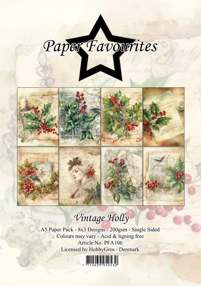 A Vintage Holly készlet 24 db A5, egyoldalas, mintás scrapbook papírt tartalmaz. Savmentes és ligninmentes (3x8 design) / 200 gsm