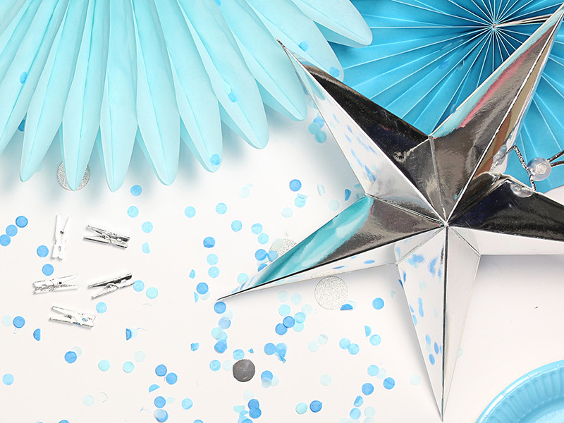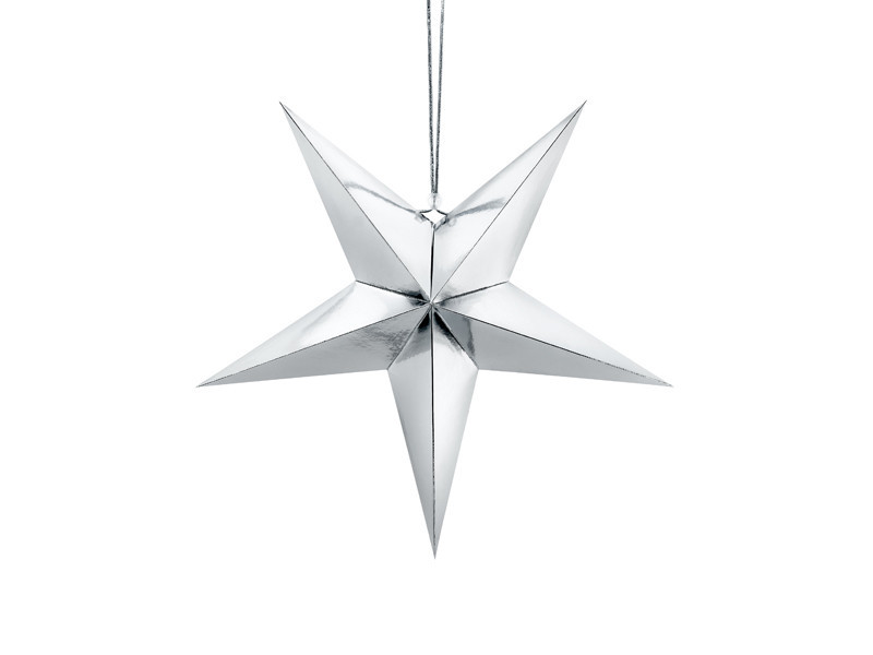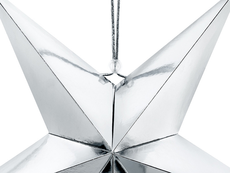 Készítsd el saját ünnepi dekorációdat ezzel a lenyűgöző ezüst papír csillaggal! Az ötágú csillag tükörfényes ezüst papírból készült, ezüst zsinórral, így tökéletes díszítőelem lehet bármilyen ünnepi alkalomra.