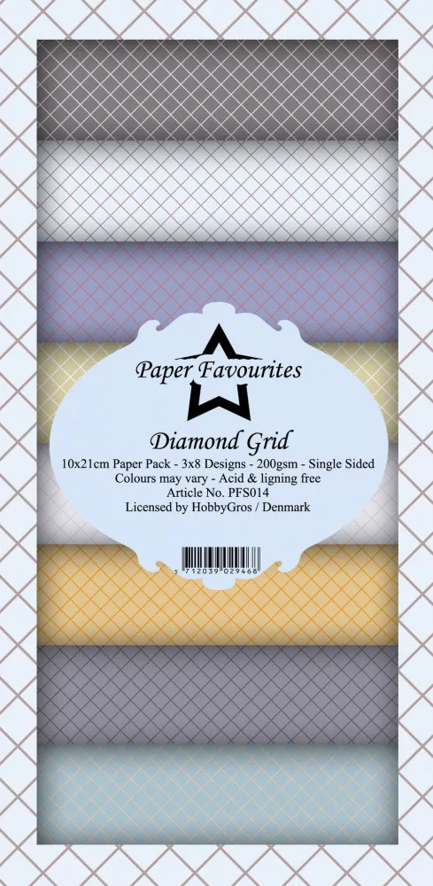 A Diamond Grid készlet 24 db 10 x 21 cm), egyoldalas, mintás scrapbook papírt tartalmaz. Savmentes és ligninmentes / 200 gsm