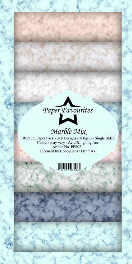 A Marble Mix készlet 24 db 10 x 21 cm), egyoldalas, mintás scrapbook papírt tartalmaz. Savmentes és ligninmentes / 200 gsm
