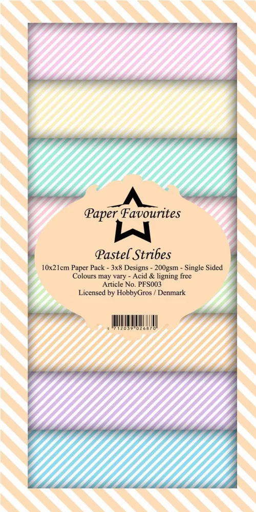 A Pastel Stribes készlet 24 db 10 x 21 cm), egyoldalas, mintás scrapbook papírt tartalmaz. Savmentes és ligninmentes / 200 gsm