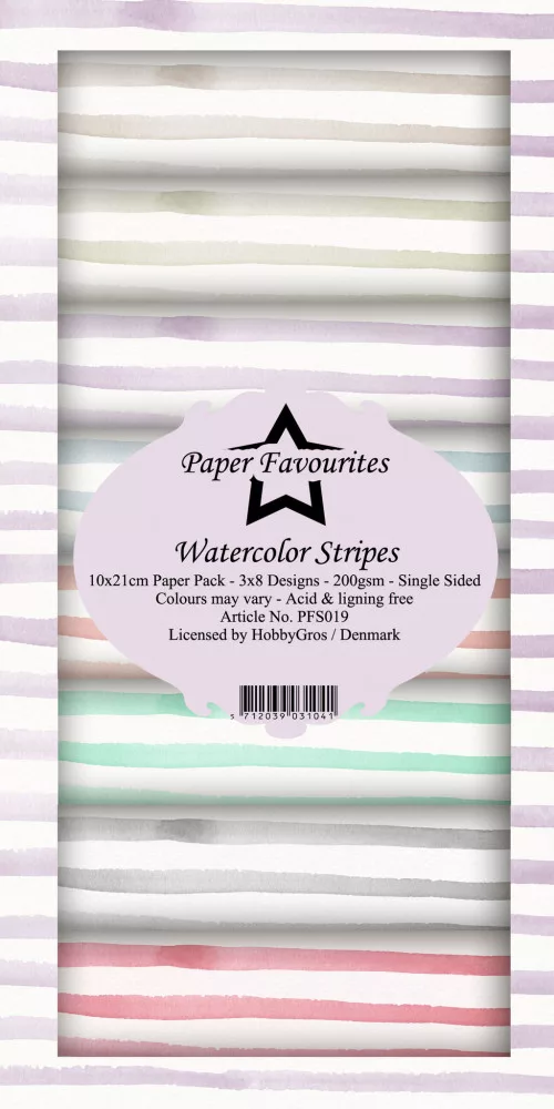 A Watercolor Stripes készlet 24 db 10 x 21 cm), egyoldalas, mintás scrapbook papírt tartalmaz. Savmentes és ligninmentes / 200 gsm
