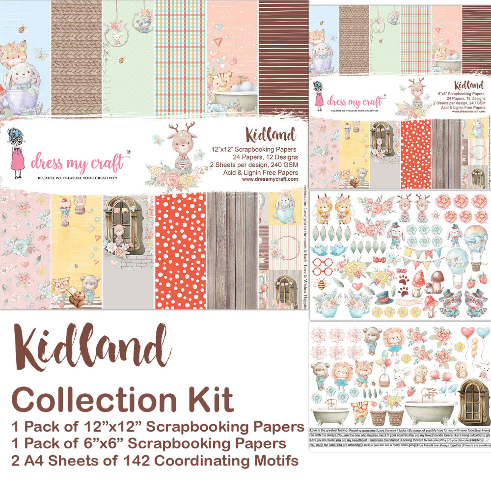 Dress My Craft Kollekció készlet! 24 db 12"x12"-es (30,48 x 30,48 cm) mintás papírt, 24 db 6"x6"-os (15x15 cm) mintás papírt és 2db A4 kivágóívet tartalmaz.. Kollekció: Kidland