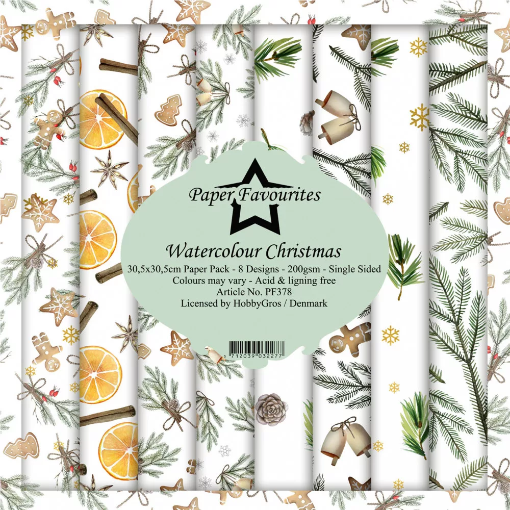 A Watercolour Christmas készlet 8 db 12x12 Inch (30.48 x 30.48 cm), egyoldalas, mintás scrapbook papírt tartalmaz. Savmentes és ligninmentes / 200 gsm