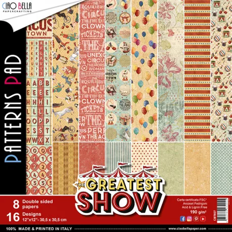 Papírkészlet - The Greatest Show. Tartalom: 8 db 12"x12"-es (30,48 x 30,48 cm), mindkét oldalán mintás scrapbook papír - 16 minta a bortóval együtt / 190 g.