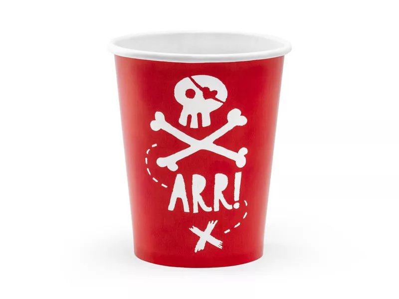 Éld át a kalózok izgalmas világát ezzel a piros színű papírpohárral, amely fehér nyomattal díszített. Tökéletes választás italok felszolgálásához bármilyen kalóz témájú bulin.