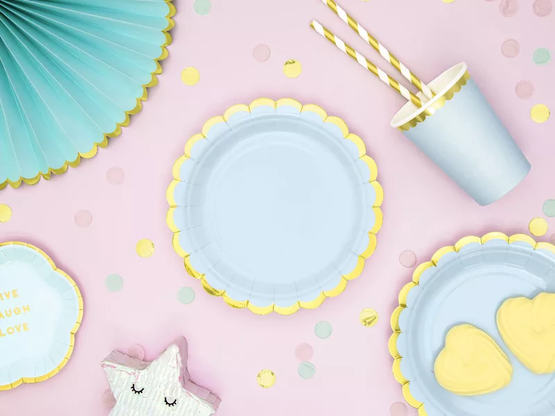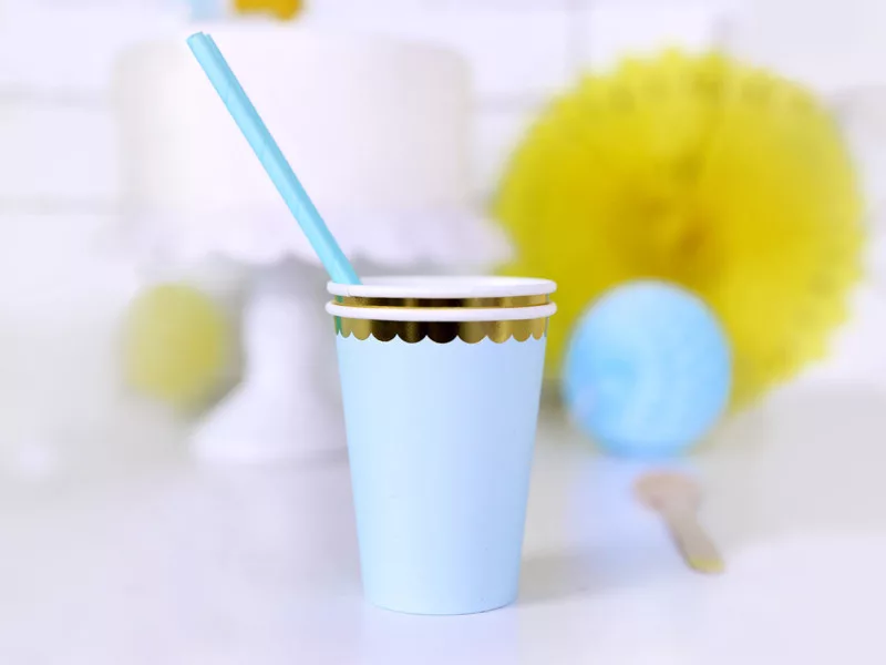 Dekoráld ünnepségeidet ezekkel a világoskék papír poharakkal, amelyek aranymetál szegéllyel díszítettek!