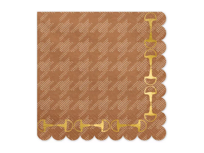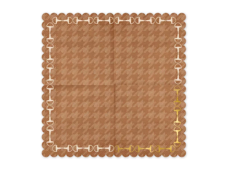 Elegáns és stílusos barna papírszalvéta klasszikus tyúklábmintával és fényes arany kengyel motívummal – tökéletes választás lovas tematikájú eseményekhez, póniklub bulikhoz, farmos rendezvényekhez vagy akár vidéki stílusú esküvőkhöz. A prémium megjelenésű szalvéták nemcsak dekoratívak, hanem praktikusak is.