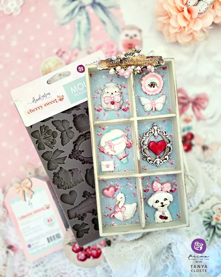 Alkoss egyedi, részletgazdag díszítőelemeket a Cherry Sweet öntőformával, amely Frank Garcia® tervezésében készült a Prima Marketing kínálatából! Használhatsz hozzá műgyantát, levegőn száradó gyurmát, agyagot vagy akár fondantot is, így nemcsak kreatív mixed media projektekhez, scrapbook-alkotásokhoz és bútorfelújításhoz ideális, hanem cukrászati díszítéshez is.