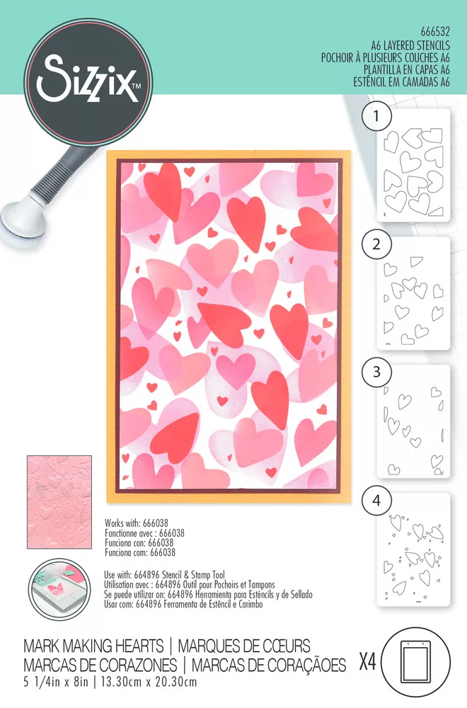 SIZZIX Stencil 666532, Mark Making Hearts / Sizzix Layered Stencil (1 csomag)