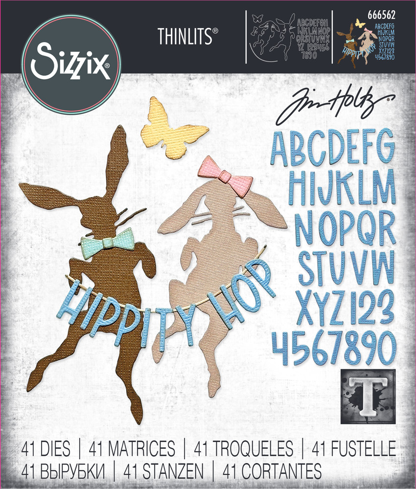 SIZZIX vágósablon - Vault Hippity Hop. Ez a Sizzix Thinlits Vault Hippity Hop vágósablon készlet nem egy, hanem két testre szabható nyuszi sziluettet tartalmaz igazi Tim Holtz stílusban, elragadó ábécé- és számdizájnnal párosítva! Sokoldalú készlet, kiválóan alkalmas tavaszi képeslapok, scrabook albumlapok készítésére és a tökéletes, személyre szabott húsvéti bulihoz is.