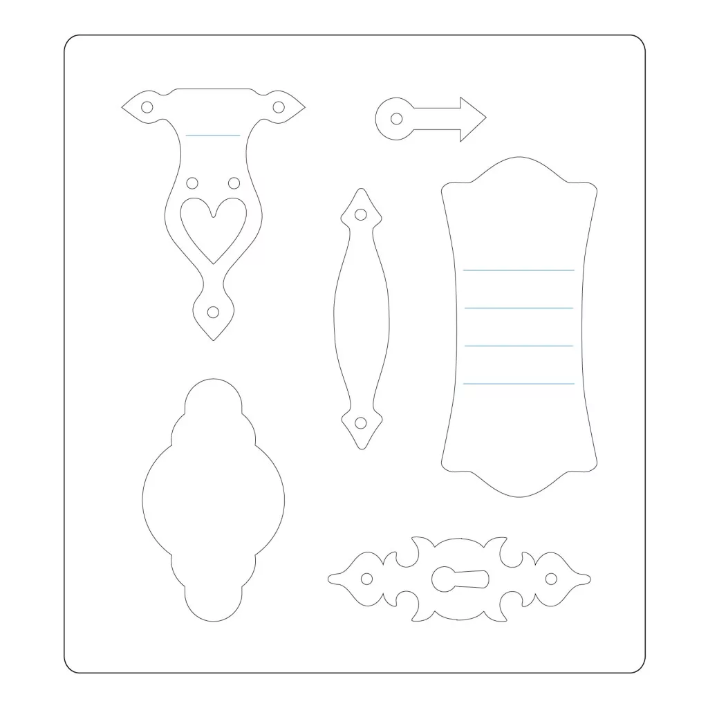 A szett díszes zsanérokat, pántokat és rögzítőelemeket tartalmaz, melyekkel stílusos, vintage vagy modern hangulatú naplóborítókat készíthetsz. Vágókartonhoz, matboardhoz és egyéb kreatív alapanyagokhoz ajánlott, és kiválóan kombinálható stencilekkel, pecsétekkel vagy egyéb díszítőelemekkel.