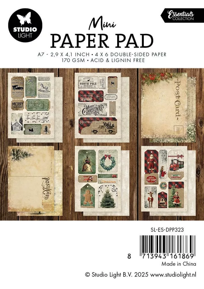 A Happy Holidays mini papírkészlet a Studio Light Essentials kollekció része, amely kifejezetten apró, részletgazdag kreatív projektekhez készült. Az A7 méretű (7,4 × 10,5 cm) karácsonyi papírblokk praktikus és hordozható, mégis elegendő helyet biztosít a díszítéshez, kivágáshoz, vagy rétegezéshez.