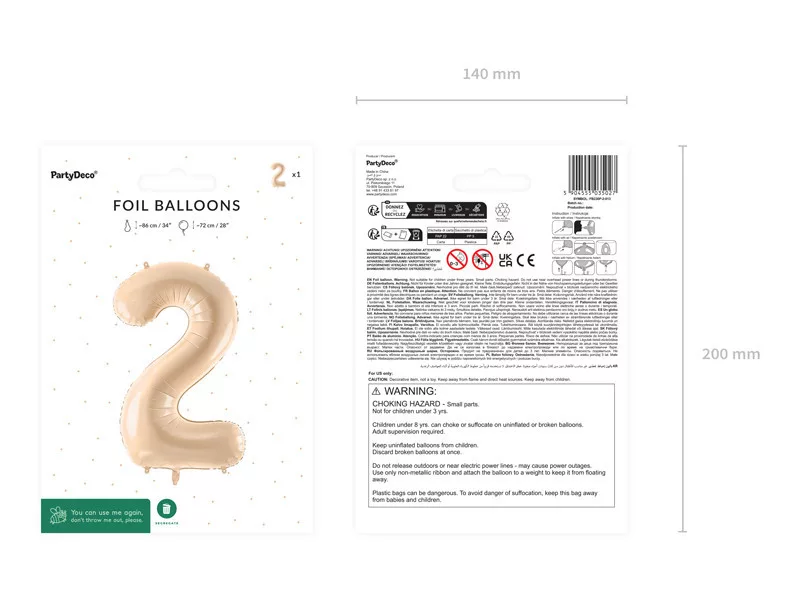 Ez a pasztell bézs színű ''2'' számot formázó fólia léggömb tökéletes kiegészítője lehet bármilyen ünnepi dekorációnak. Negyméretű lufi, felfújás előtt mérete kb. 86 cm (34''), felfújva pedig kb. 72 cm (28'').