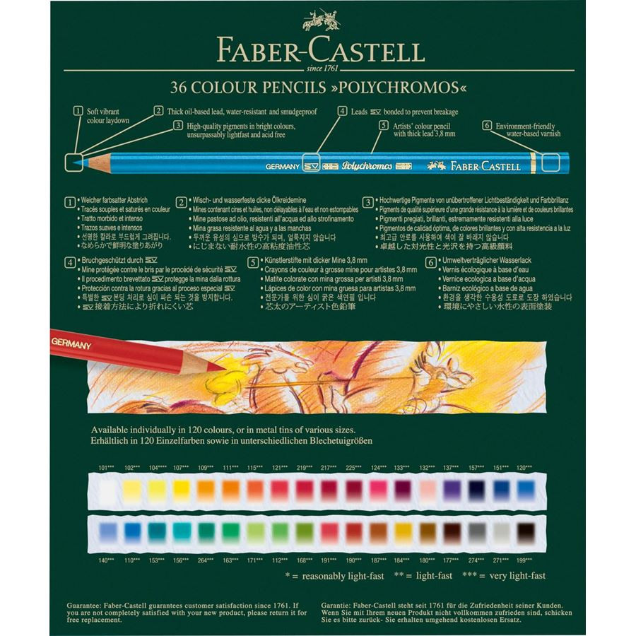 Faber-Castell Polychromos művész színesceruza jellemzői: élénk színek, könnyen keverhető színekkel finom átmenetek érhetők el, olaj alapú ceruzabél, rendkívül fényálló, intenzív - tartós pigmentek, 3.8 mm átmérőjű ceruzatöltet, mely biztosítja könnyű hegyezhetőséget, törésálló, vízálló, elkenődés-mentes.