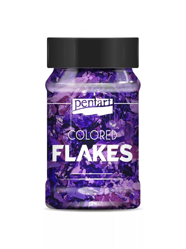 Színes fólia pehely min. 1 g, sötétlila. Rendkívül vékony, színes, metál hatású fólia, melyet az öntapadóra száradó ragasztóval vagy a füstfólia ragasztóval vihetünk fel a díszítendő felületre. A munka zárására használjunk Pouring lakkot. A pelyhek 11 színben kaphatóak, ebből 3 vegyes színű. A lapokat 8 színben kínáljuk.